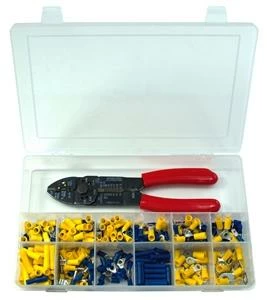 QuickCable PVC Solderless Connector Kit With Crimper. Quality terminals for years of dependable service. Terminals come tin plated annealed copper for improved corrosion resistance, max conductivity, and crimp strength. Serrated barrels offer greater wire retention/pullout strength, and ridged PVC sleeves offer improved abrasion resistance.