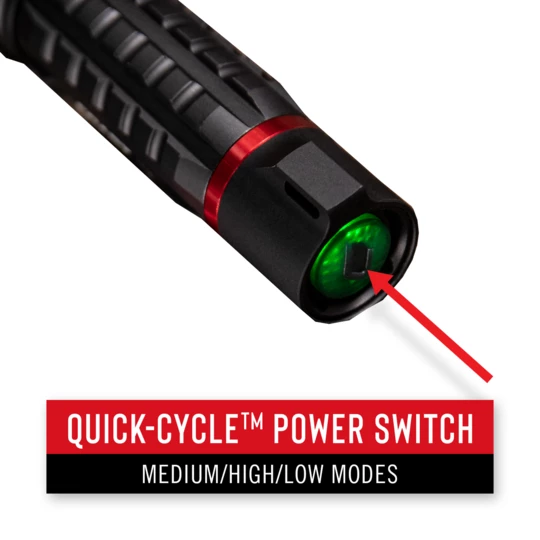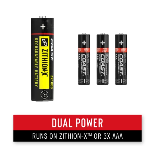 Featuring COAST Rechargeable Dual Power technology, this IP54 dust-resistant and storm proof flashlight is powered by a COAST ZITHION-X™ rechargeable battery (charging cable included) but can also run on standard alkaline AAA’s (purchased separately)—with a real-time power indicator so that you always know when to power up.
