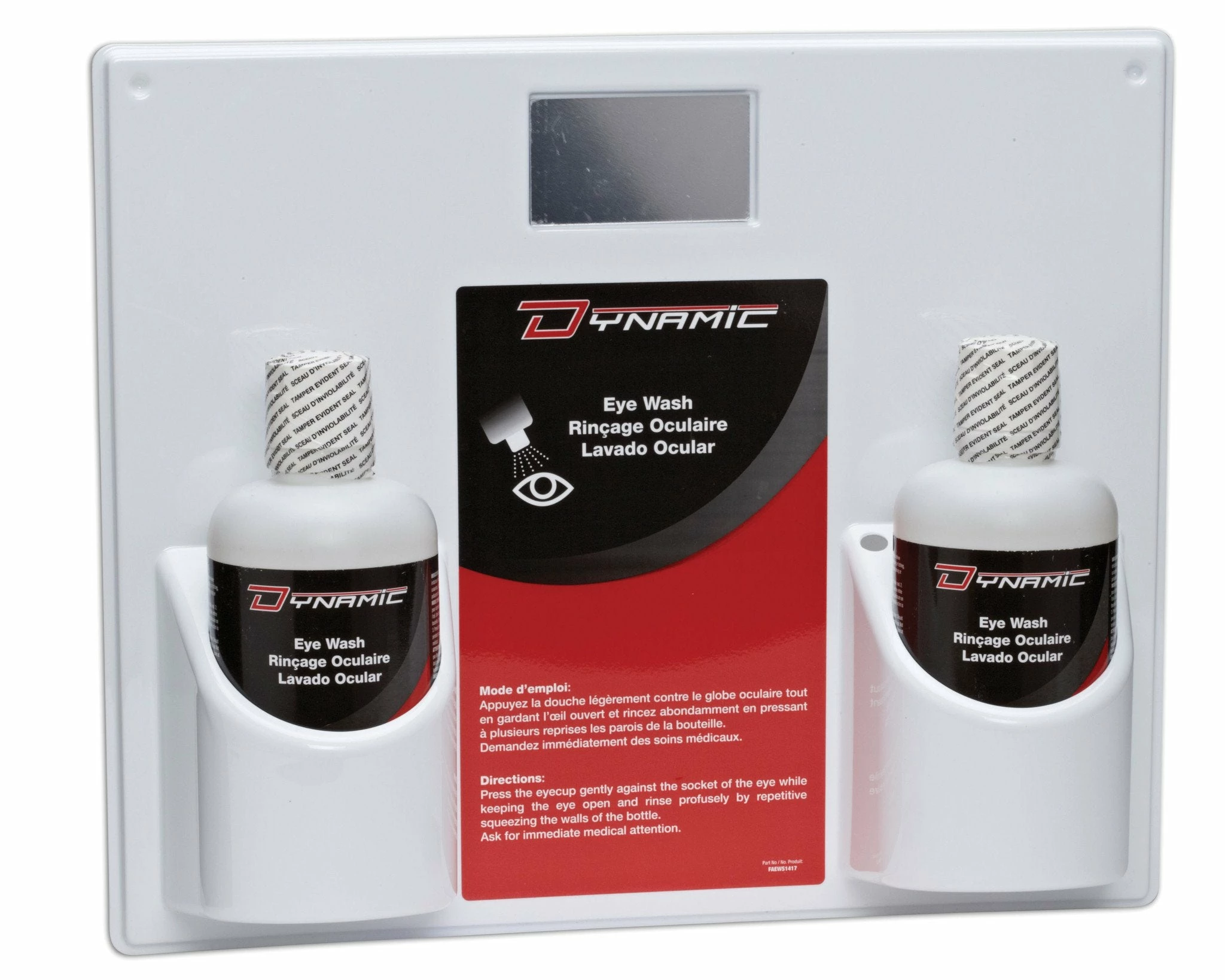 Dynamic Dual Eyewash Station comes complete with two full 1L (32 oz) bottles of isotonic eyewash solution. It has a built-in mirror to view contaminated eyes or face.