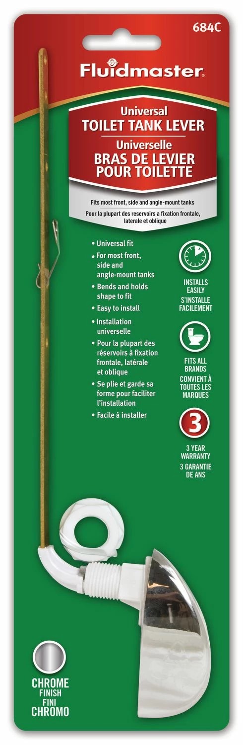 Fluidmaster®’s Designer tank levers can be trimmed and bent to fit most any tank. While the durable brass arm resists corrosion or breaking for a long lifespan, and offers a 3 year warranty. Here the 684C Tank Lever showcases a classic Chrome finish to quickly upgrade and match any bathroom. Replace your broken, or old toilet handle with a curved chrome design.