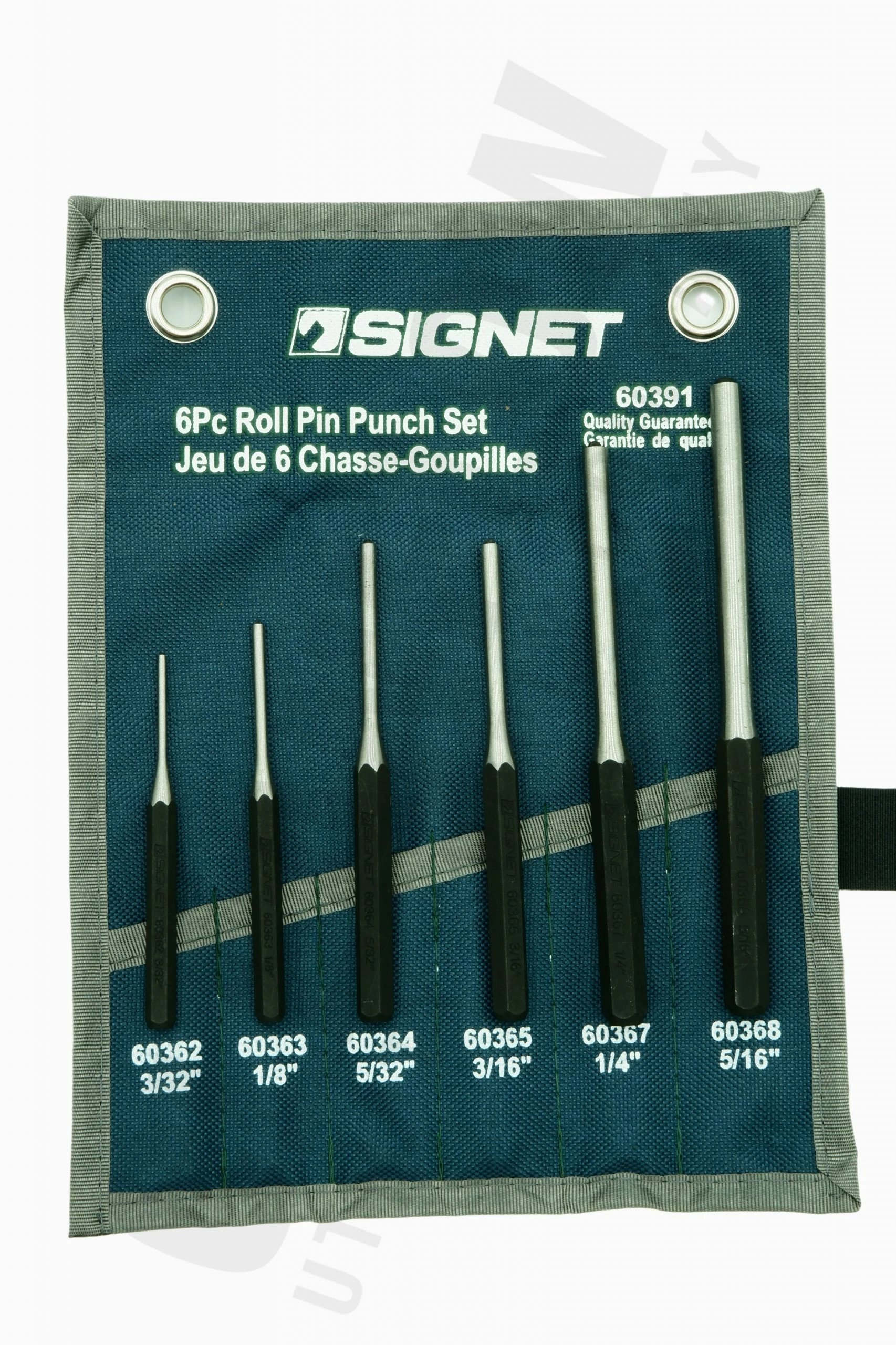 Signet 6 Piece Roll Pin Punch Set has chrome vanadium punches with annealing striking heads that will not mushroom. Black, polished tips are heat treated.