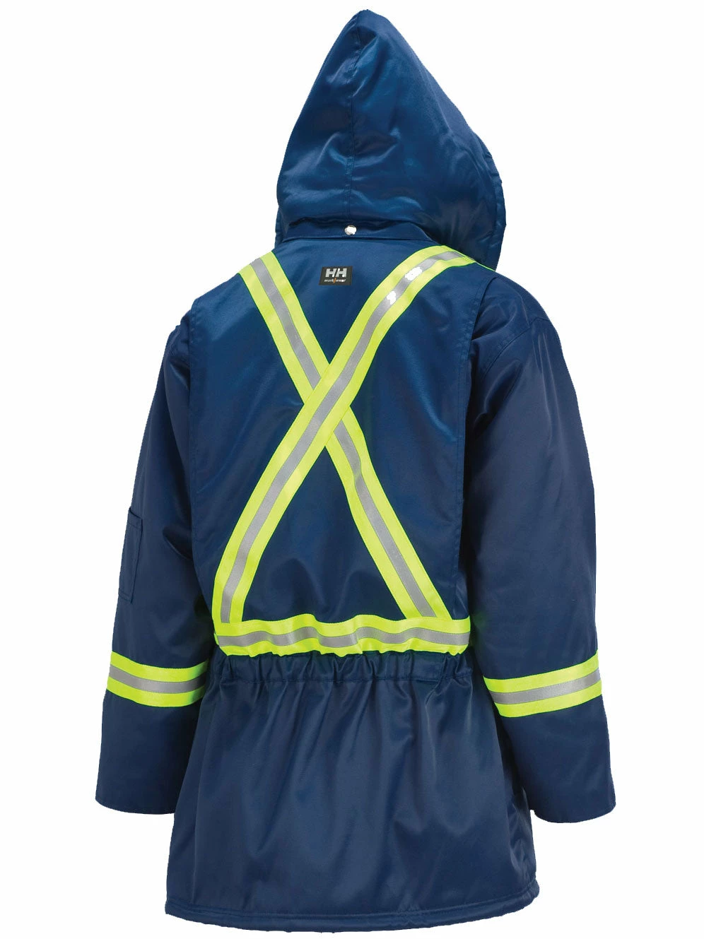 Helly Hansen’s Weyburn parka with reflective striping keeps you visible and safe when you’re working on outdoor sites. It offers a generous fit that’s ideal for layering over your work wear and its water-repellent so you’re protected when the weather gets wet. For clear days, the hood is detachable. The fit is customizable, thanks to an elasticated waist and inner wind belt. Chest pockets and front cargo pockets offer handy storage, making this jacket both practical and protective. The Weyburn Hi-Vis Parka is used in the coldest conditions on earth.