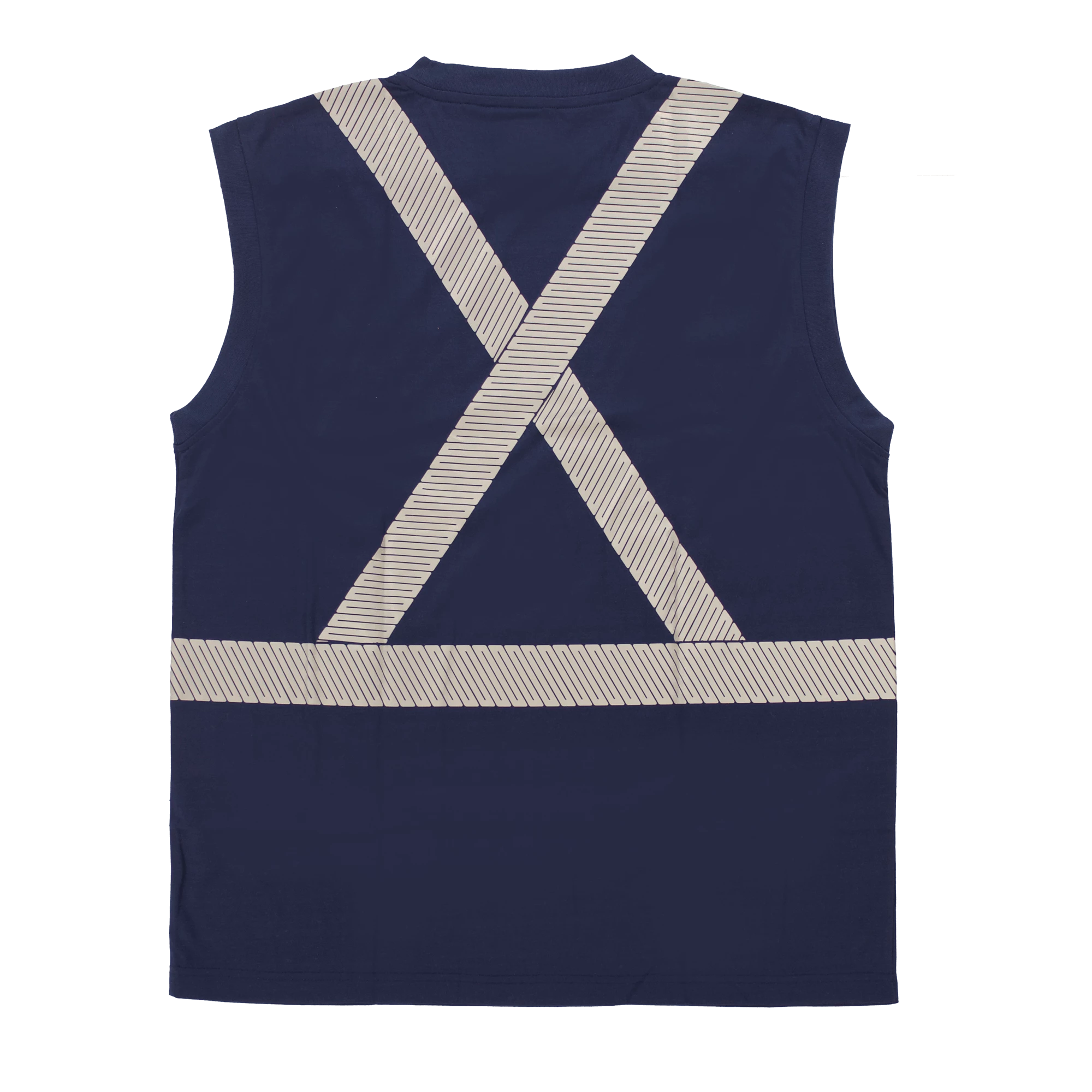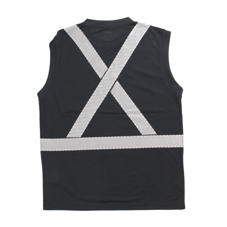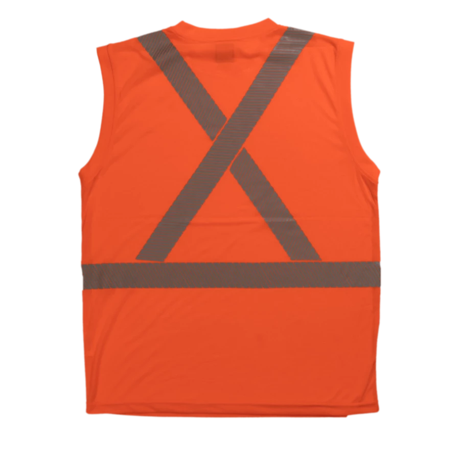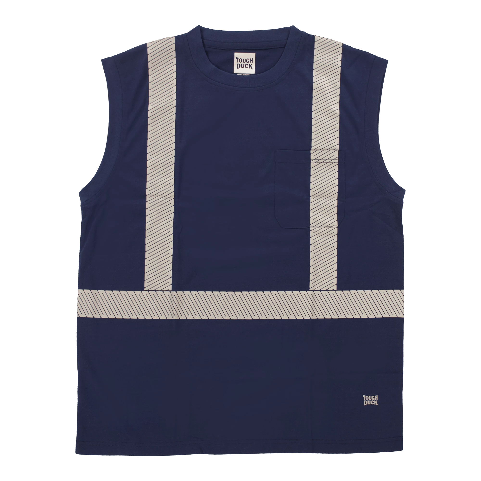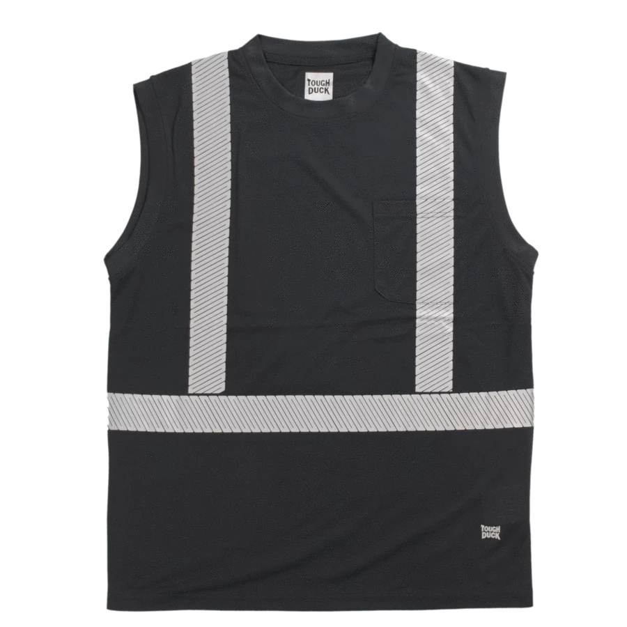 Tough Duck’s sleeveless summer safety shirt. Made of lightweight, soft, easy-to-wear polyester jersey with comfortable retroreflective striping.
