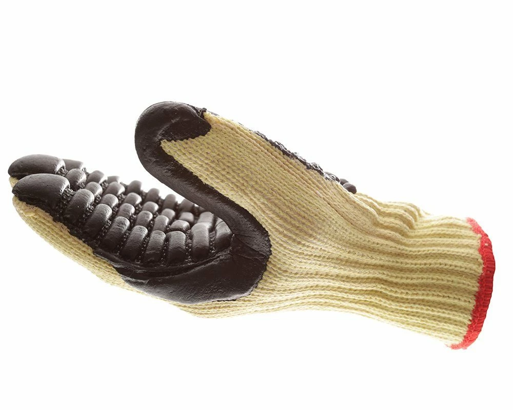 IMPACTO Anti-Vibration Anti-Slash Gloves are made with 60% KEVLAR® and 40% cotton seamless knit material (7 gauge liner). Encapsulated air coating in the palm, fingers and thumb cushion and dampen vibration and impact while ensuring optimum dexterity, lightweight feel and reduced bunching.