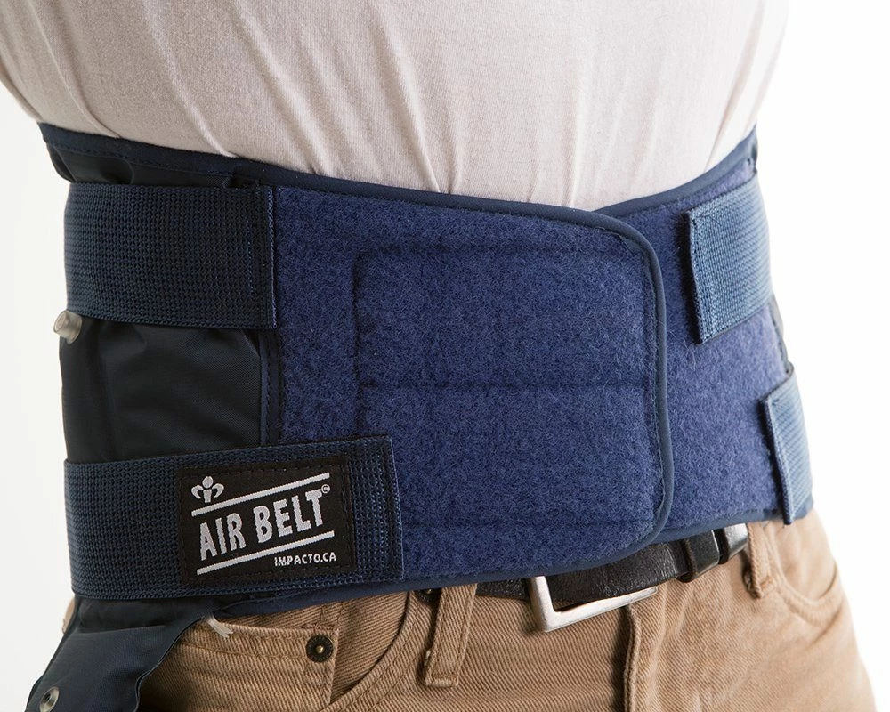 IMPACTO Air Belt® Lumbar Support Belt. Palm-grip self-contained aspirator with pressure release valve regulates air intake. Contoured inter-connected air chambers. Lightweight moisture absorbing inner lining. Durable nylon outer cover. Three adjustable straps provide additional support.