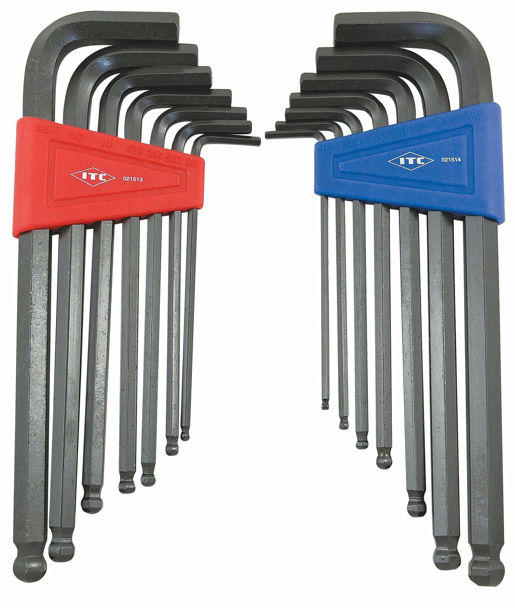 ITC 14-Piece Ball Nose Hex Key Set is made with chrome vanadium. Ball nose design allows engagement of fastener at up to 25° angle. Convenient plastic holders. Combines S.A.E. and metric sets for maximum range.