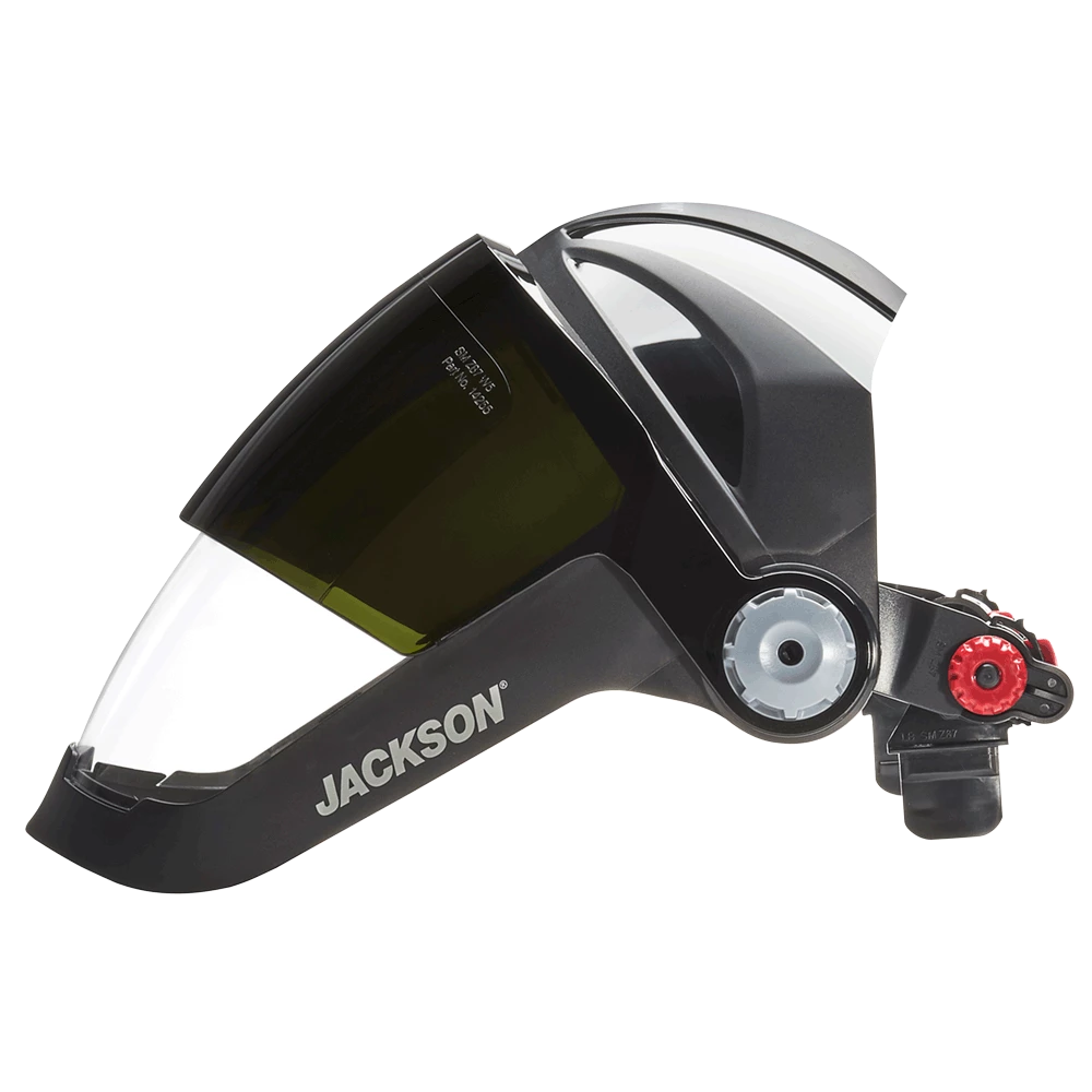 Jackson Safety Personal Protective Equipment Jackson Quad 500® Series Hard Hat Mountable Complete Faceshield With 370 Speed Dial™ Ratchet Adjustment – Clear With Flip-Up Shade 8 Window