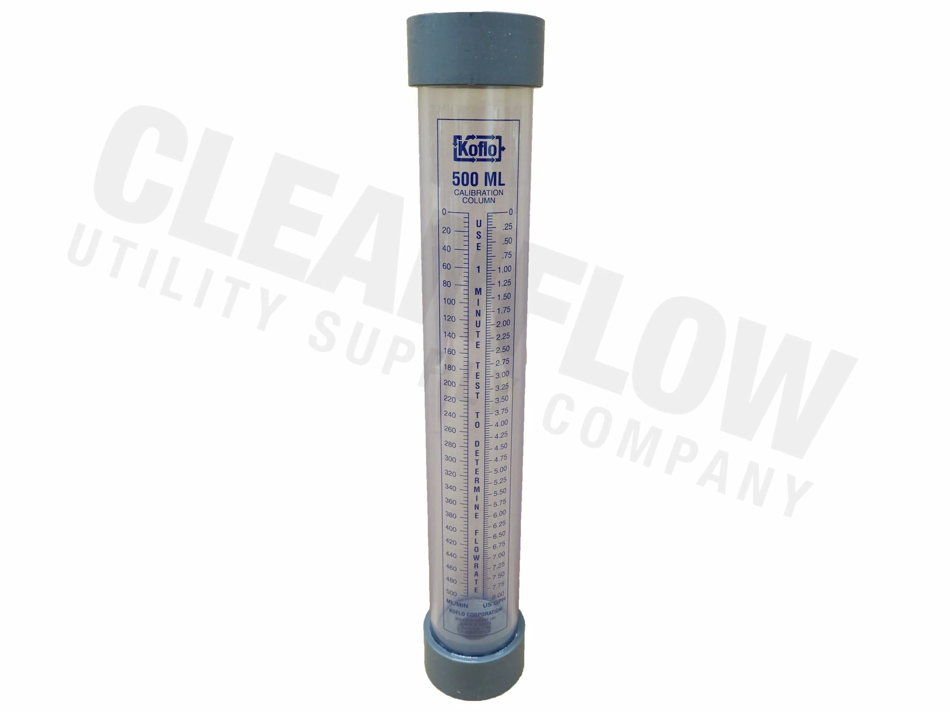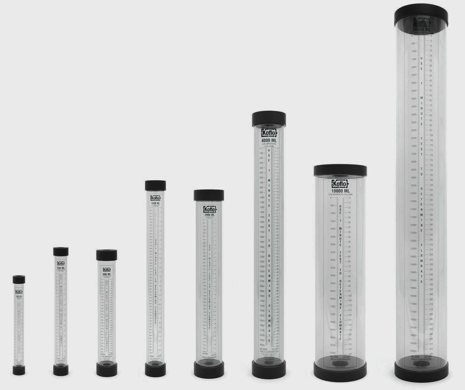 Koflo Metering Pump Calibration Columns provide an easy method for determining pump flow rate using industry standard graduations of mL/min and GPH. An equal starting point for both graduated scales gives the operator both mL/min and GPH in one test.