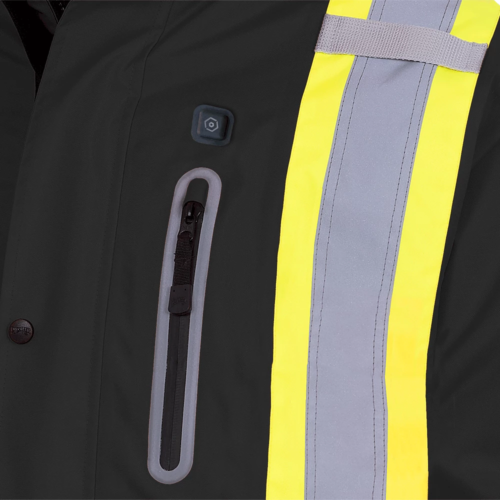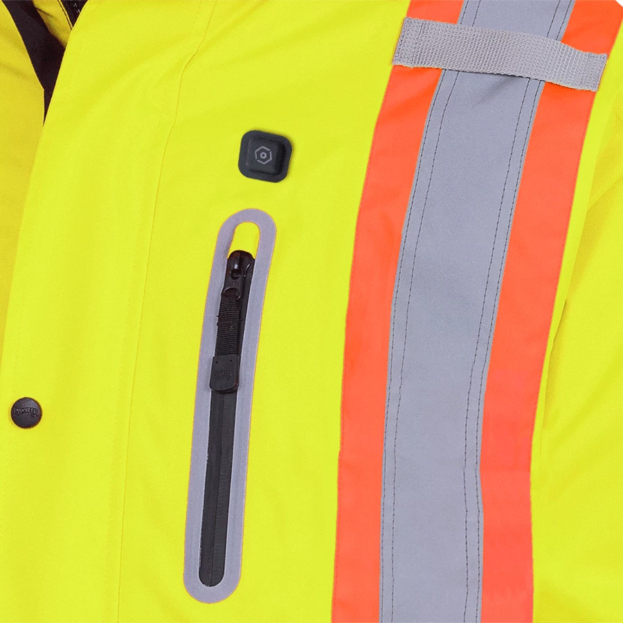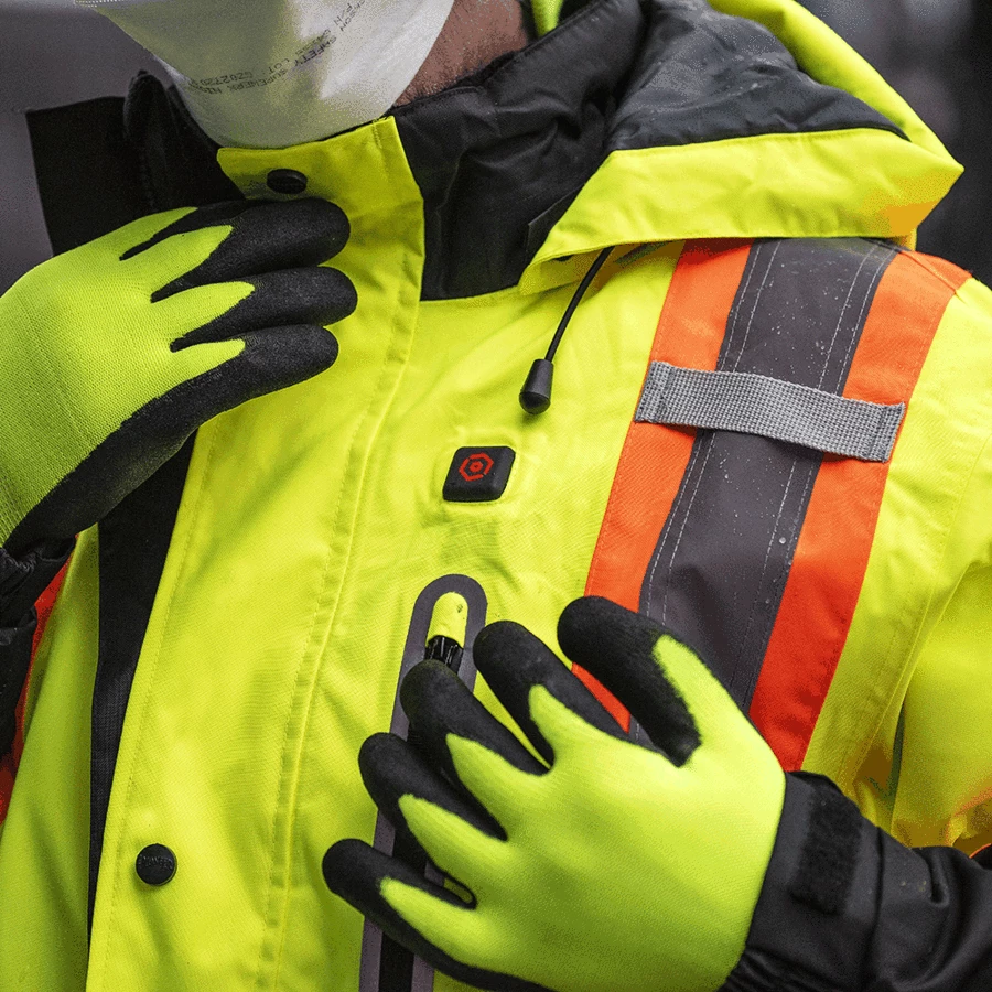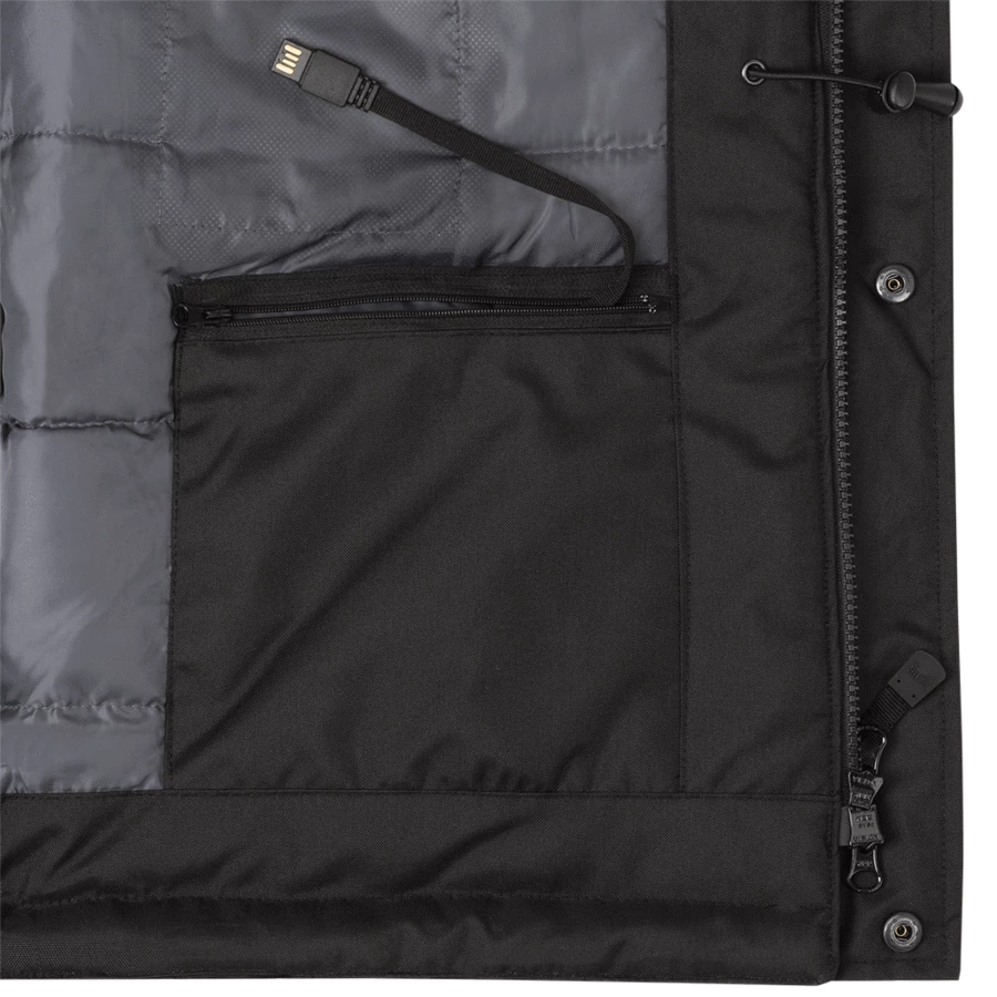 | There are 4 heat settings: 38°C, 43°C, 48°C and 53°C, indicated by coloured LED’s. Select your heat setting by pressing the main switch button. This jacket is compatible with various power banks, refer to the chart below for heating capacity and how many hours of warmth this jacket will provide. |