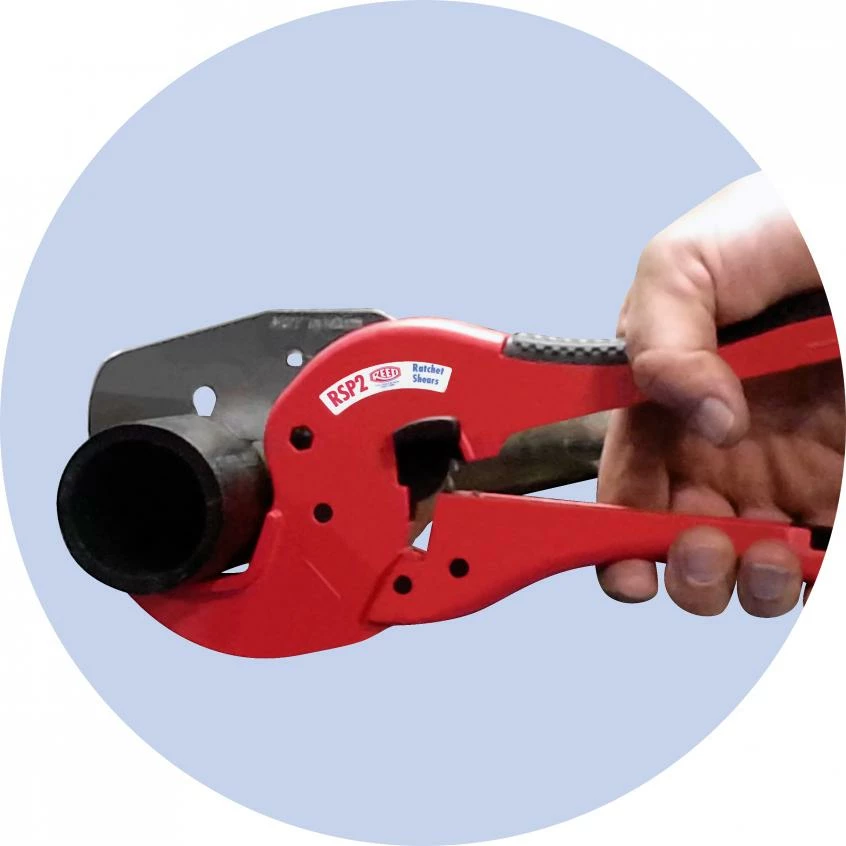 Reed RSP2 One-Handed Pointed Blade Ratchet Shears are ideal for cutting PE, PP, PEX, and ABS pipe and tubing. Pointed blade in one-hand, ratcheting RSP2 helps start the cut in tough plastics and helps avoid bounce in thin wall material. V-shaped cradle supports pipe giving 3 touch points – 2 at bottom and main one on blade.