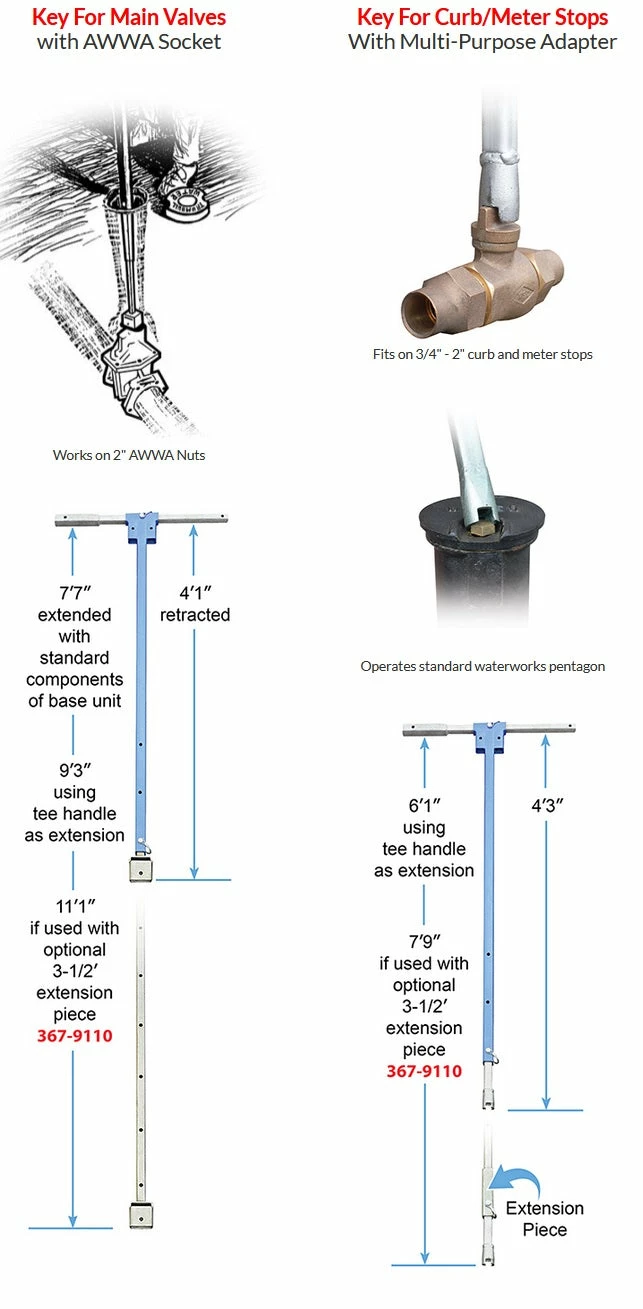 Trumbull Valve & Curb Key Kit and Adapters operate main valves, curb and meter stops, and a variety of curb box rods and lids. Tool collapses to compact 4′-1″ length for convenient storage in utility vehicles. Carrying case included. (An optional 3.5 ft extension is available at extra cost).