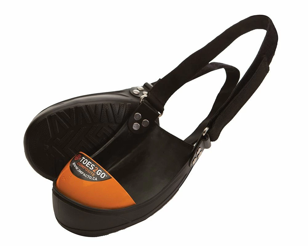 IMPACTO TOES2GO Composite toe cap overshoes protects the toe area from accidental impact, crushing or stubbing. Made of flexible, pliable PVC. Treads under sole to prevent slipping and help liquid flow away from the foot. Adjustable strap with hook and loop closure.