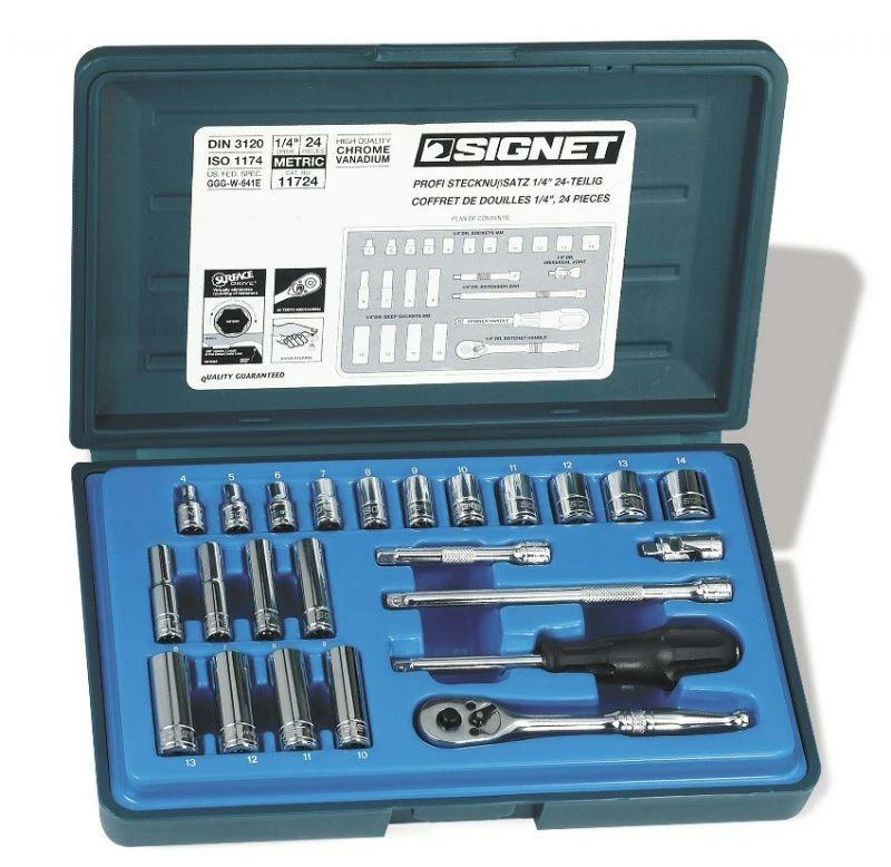 Signet 1/4″ Drive 24 Piece Metric Socket Set is contained within a quality, durable blow molded case. Surface Drive™ configuration virtually eliminates the rounding of fasteners. Ratchets have a locking/quick release button, which will hold the socket firmly until the locking/quick release button is again pressed to ensure no more dropped sockets. Ratchets have a 45 teeth count.